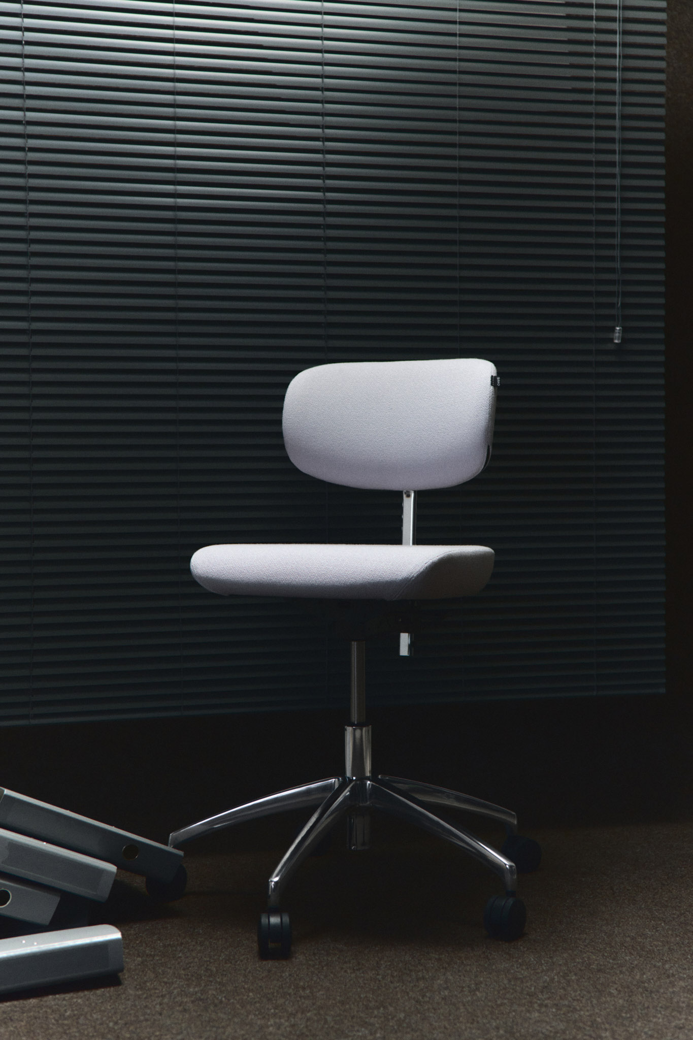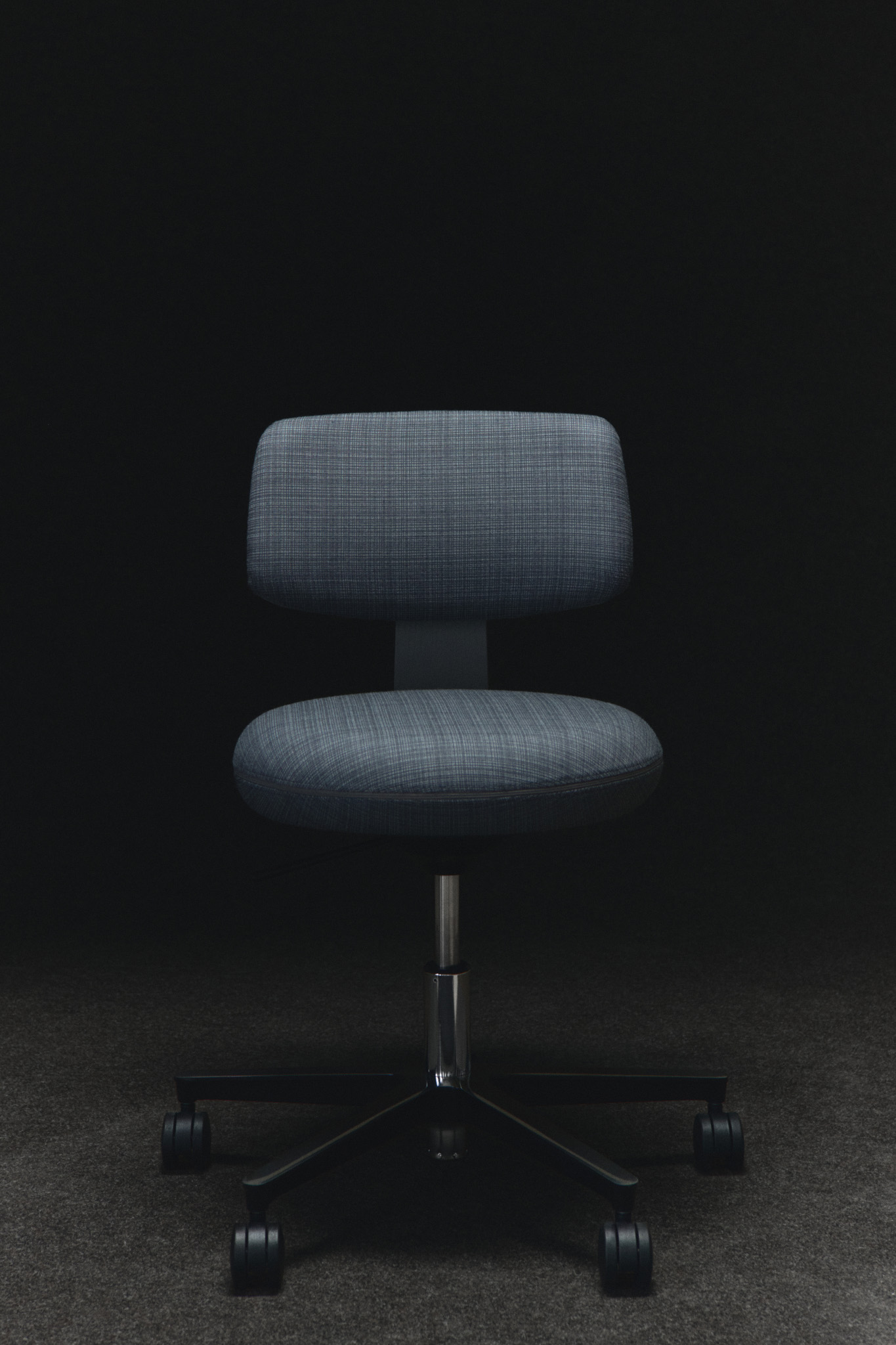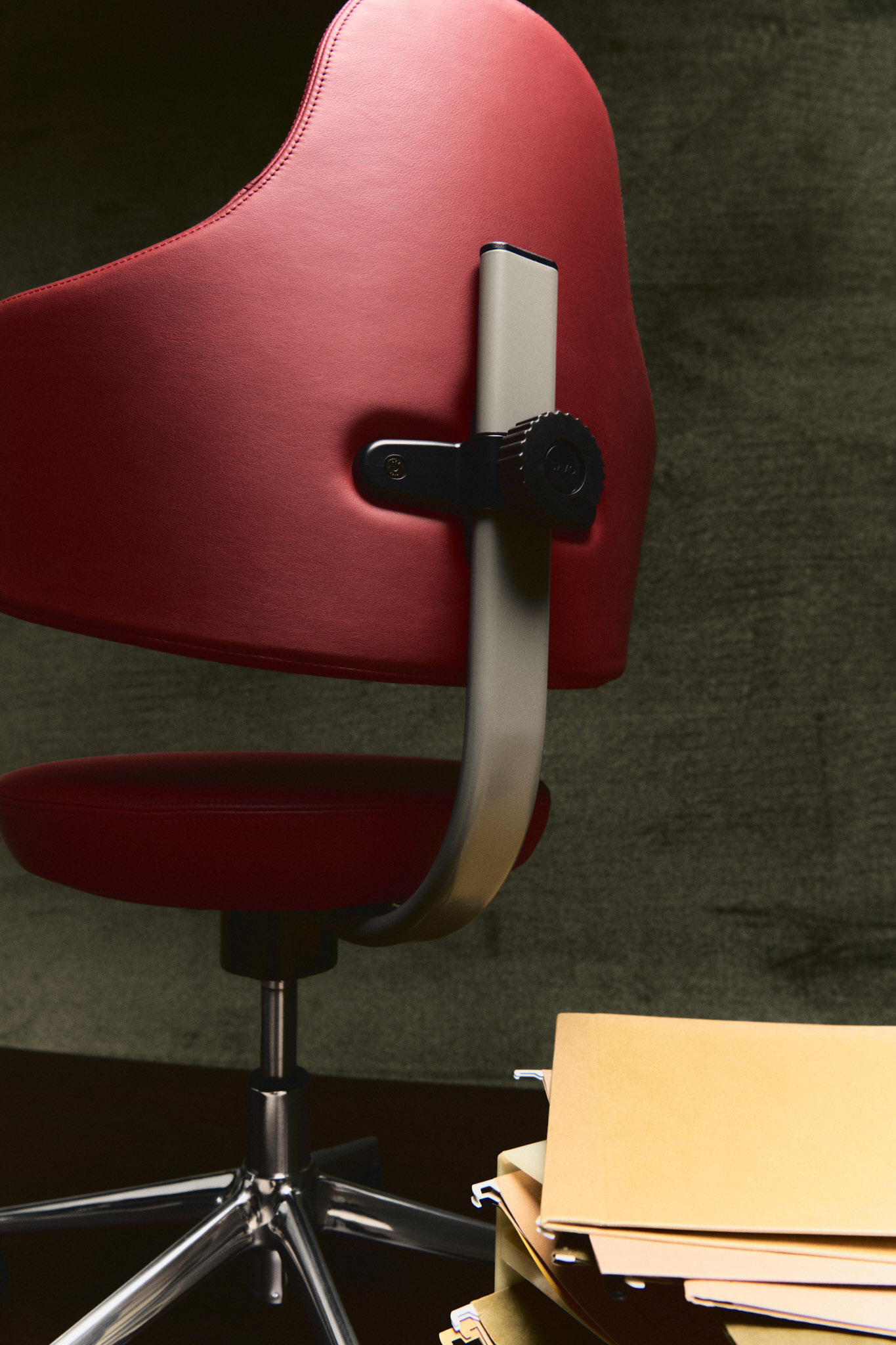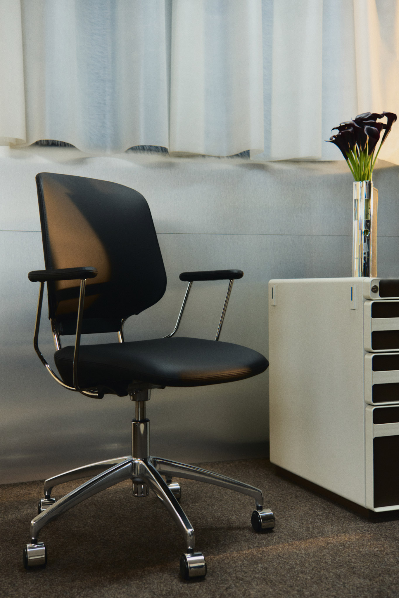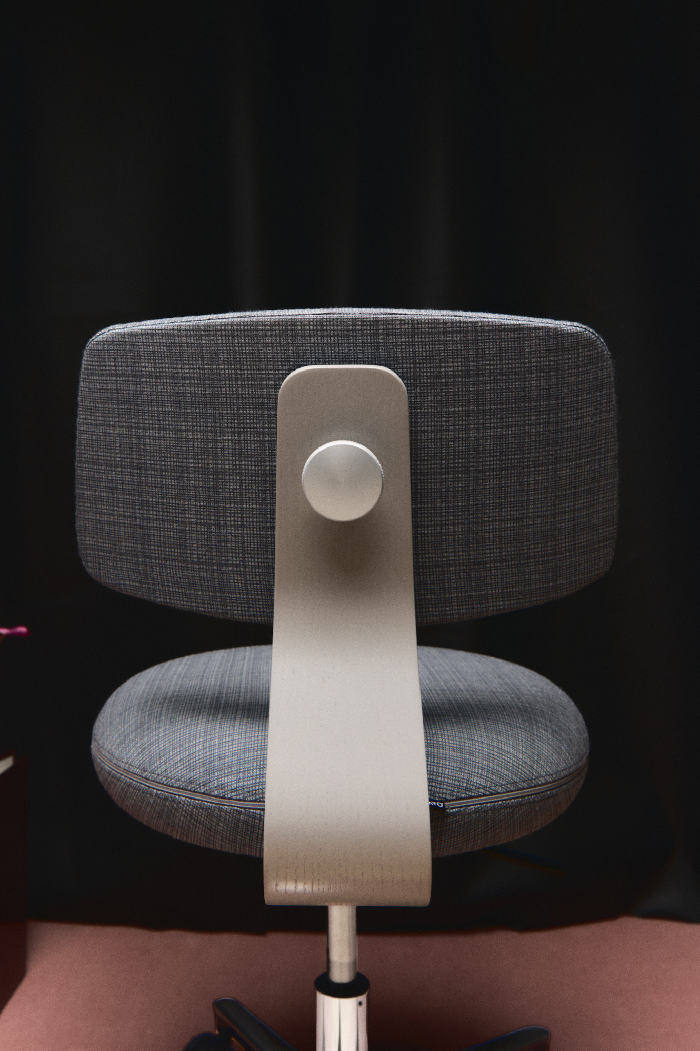 Metallkrysset og de mørkere hjulene tilfører både visuell tyngde og stabilitet. Sammen skaper de en stol som står stødig i rommet, samtidig som den reflekterer et bevisst forhold til form, funksjon og komfort.
