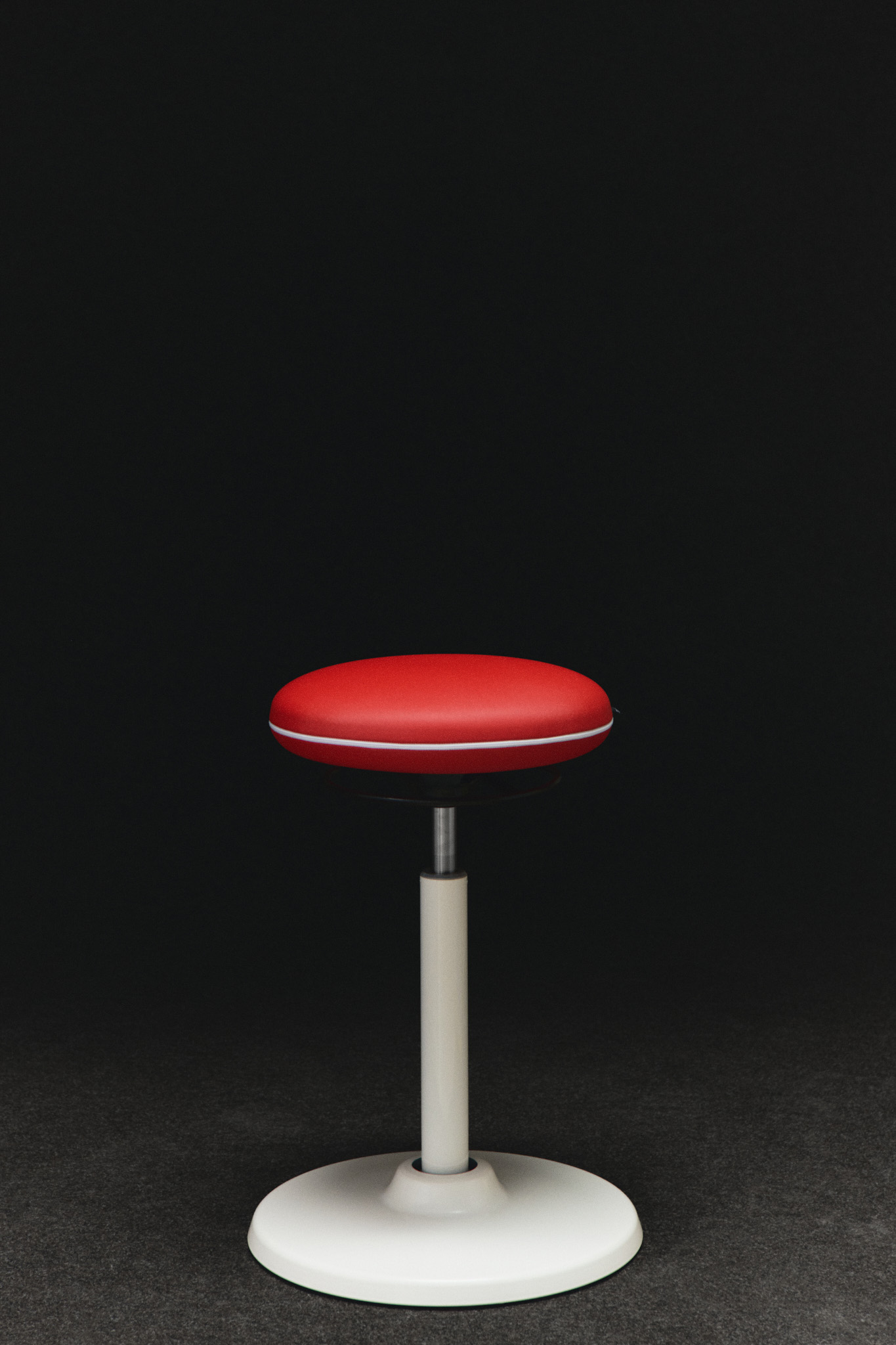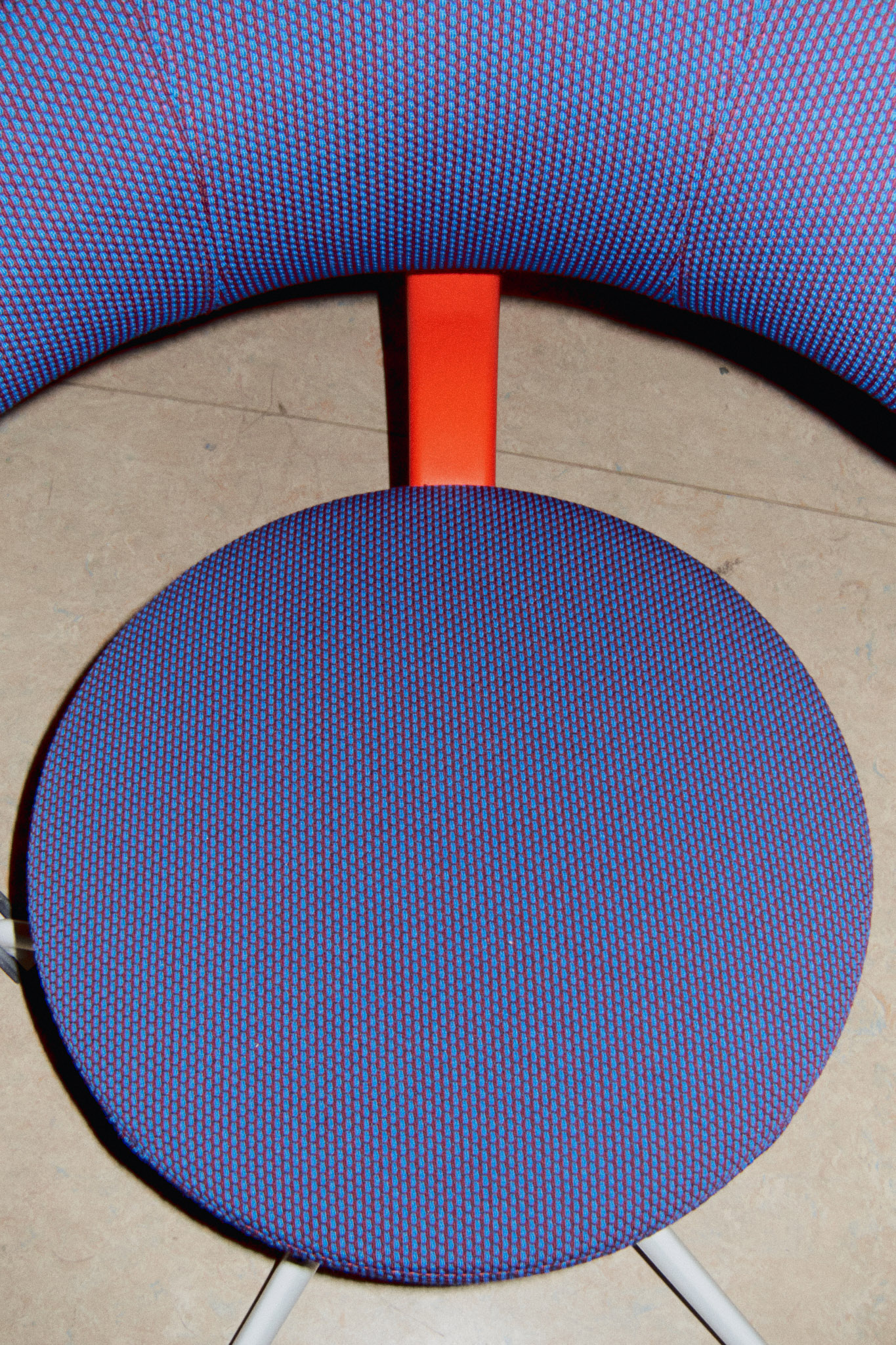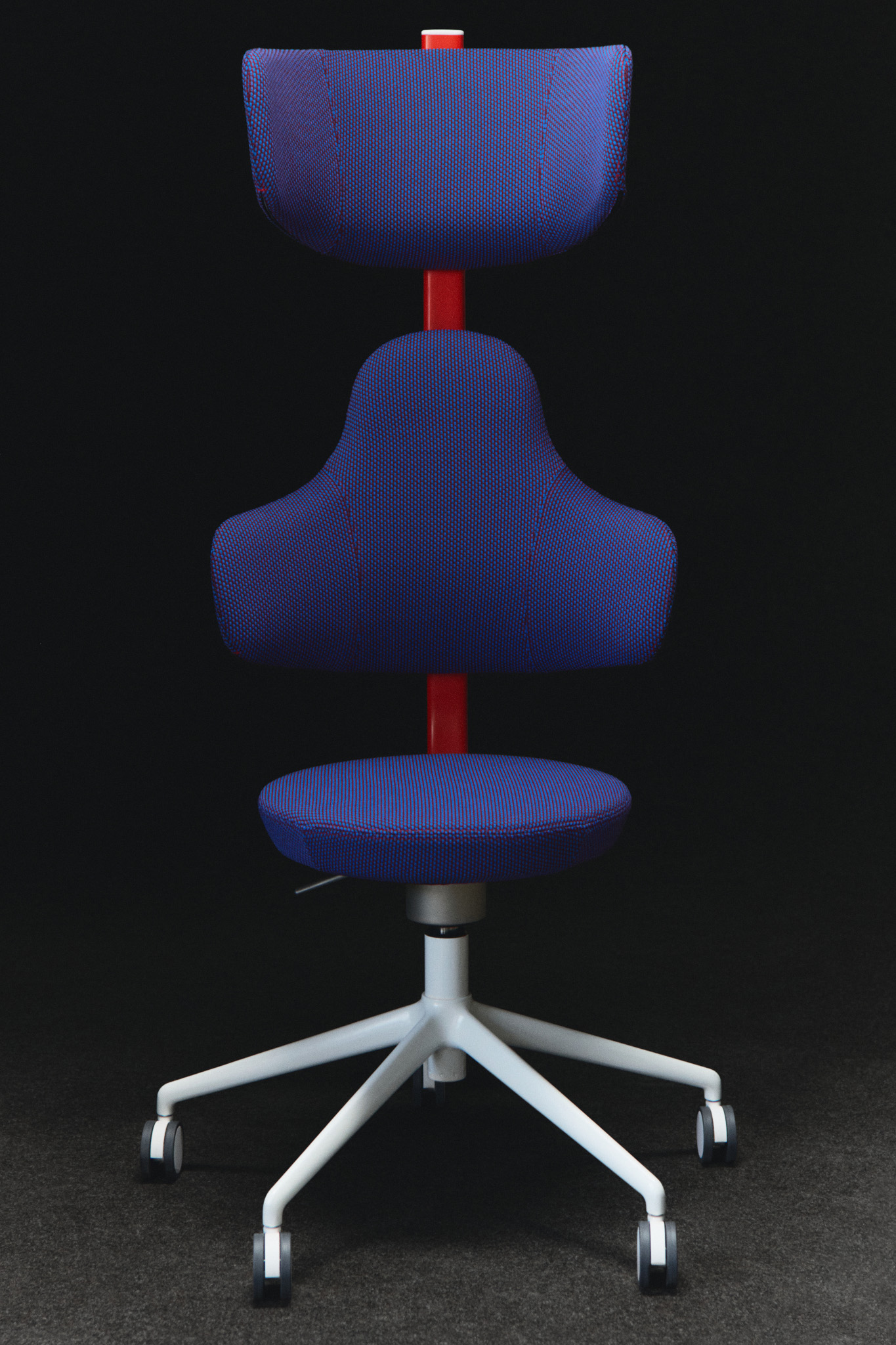 En rød ryggsøyle med en metallfarget prikk gir fokus og struktur, mens blå polstring med lyseblå sømmer mykner helheten. Hvite ben og hjul skaper et rent fundament. Et tydelig eksempel på hvordan farge og ergonomi samspiller.
