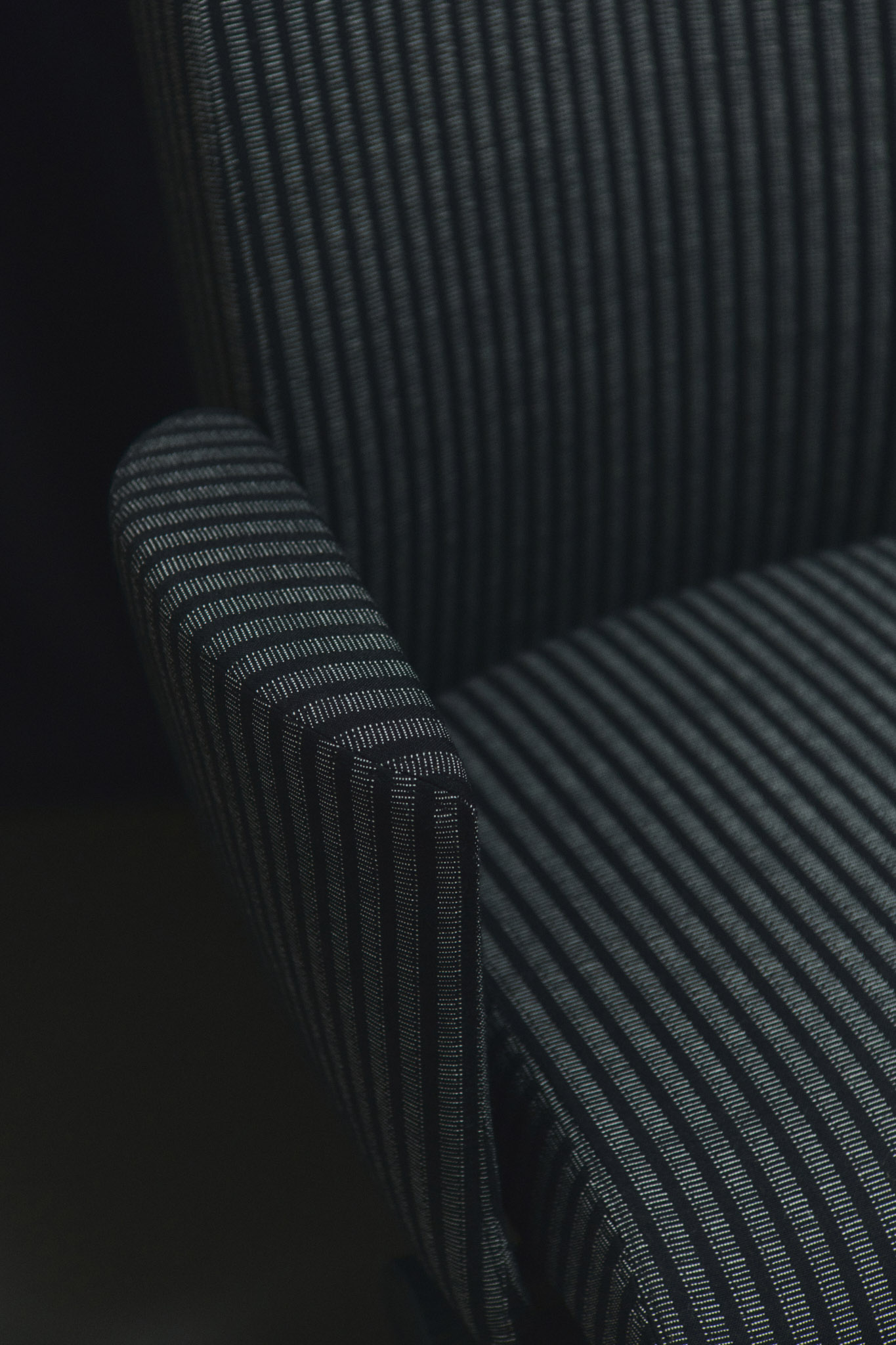 Det mørkeblå, stripete stoffet tilfører dybde og presisjon – skreddersydd, balansert og diskret markant. Metallben og polstrede armlener rammer inn formen.