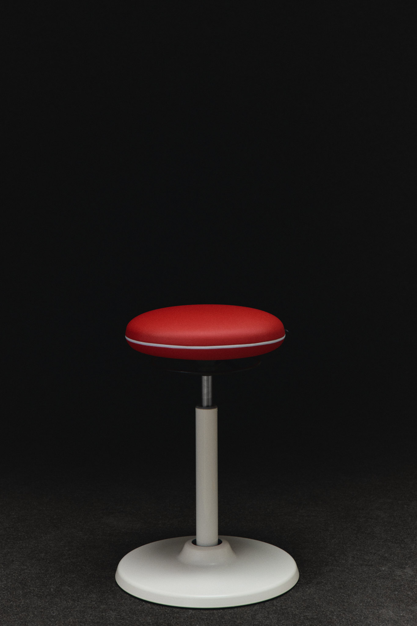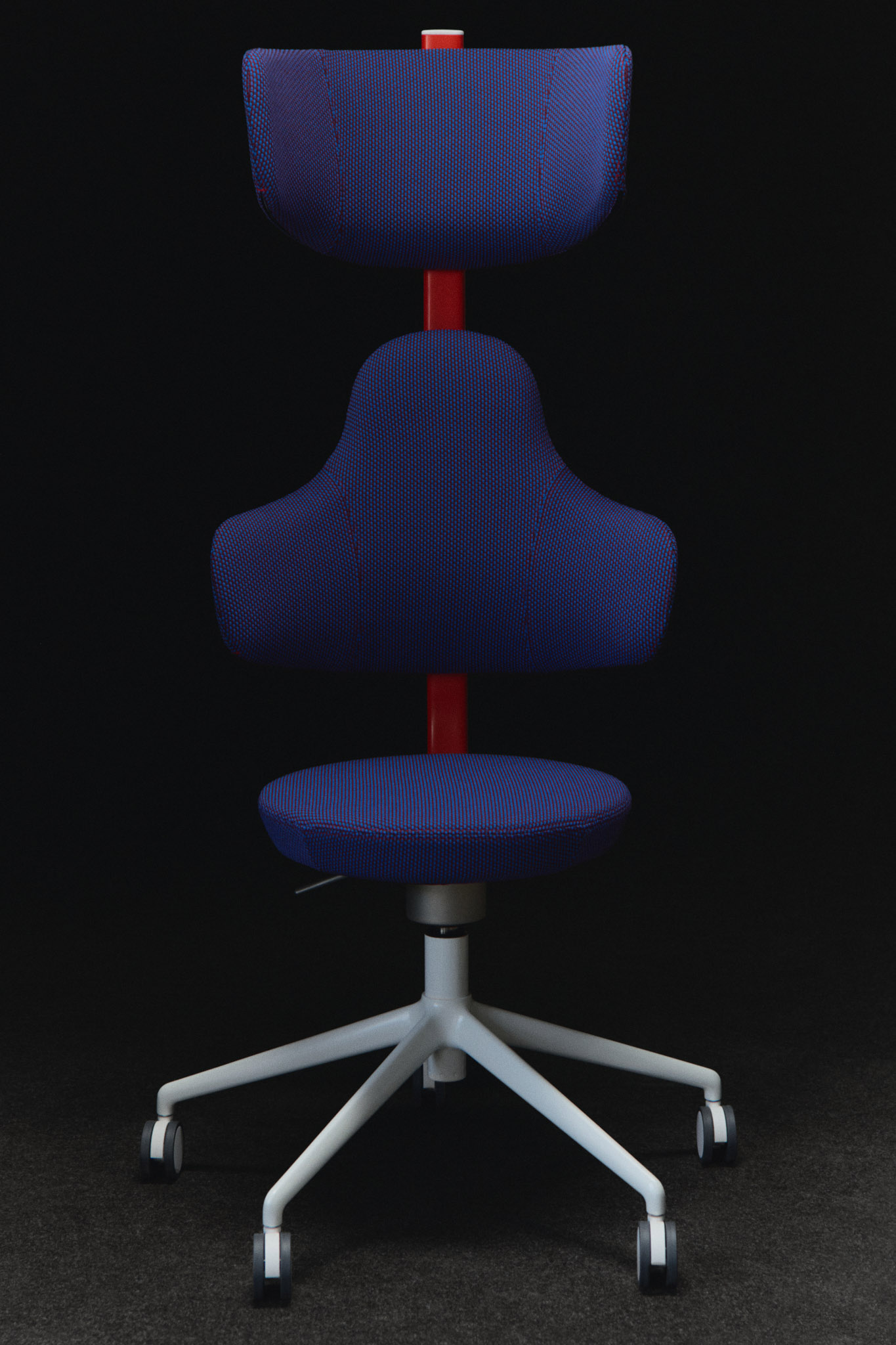 En röd ryggpelare med en metallfärgad dot ger fokus och struktur, medan blå klädsel med ljusblå sömmar mjukar upp helheten. Vita ben och hjul skapar en ren grund. Ett tydligt exempel på hur färg och ergonomi samspelar.