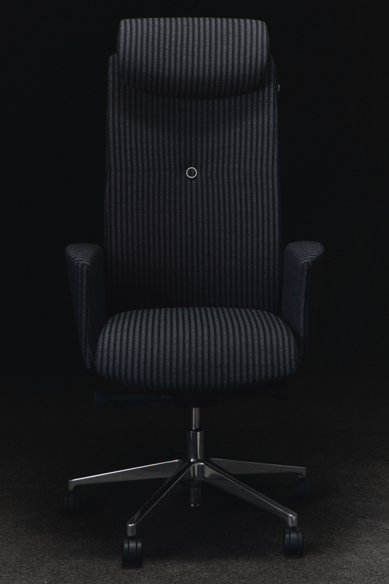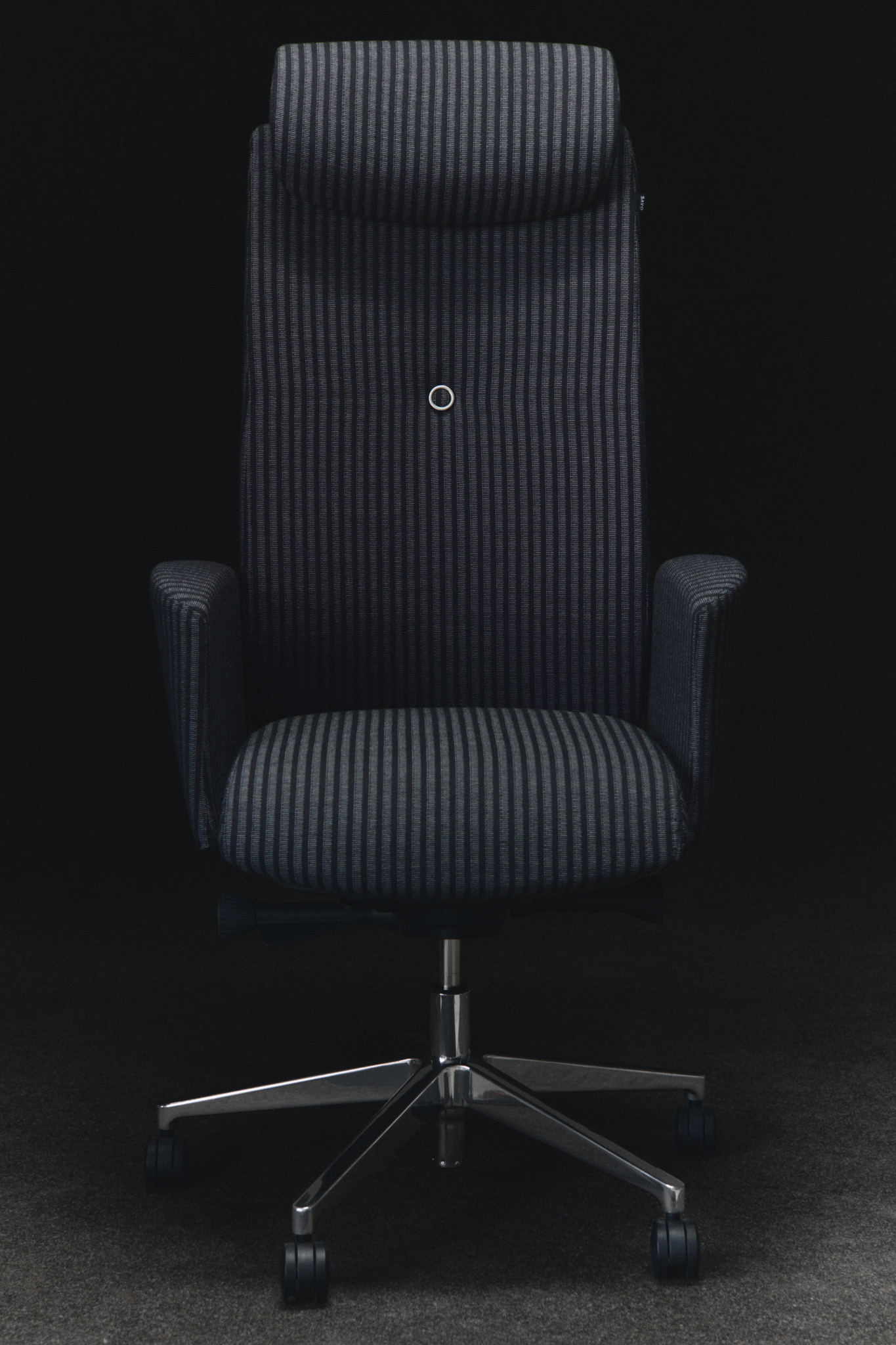 Det mörkblå, kritstrecksrandiga tyget adderar djup och precision – skräddat, balanserat och lågmält distinkt. Metallben och klädda armstöd ramar in formen.