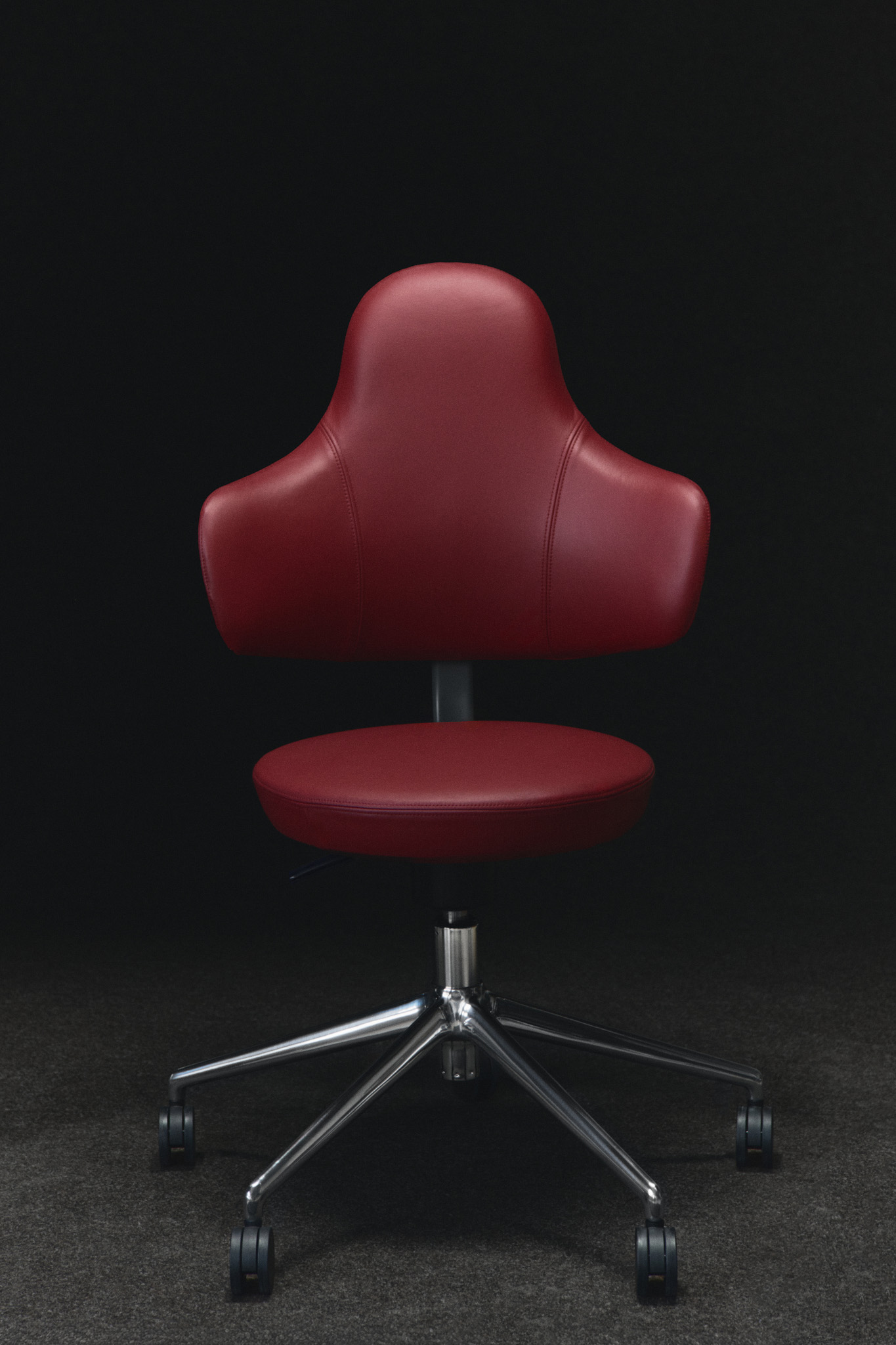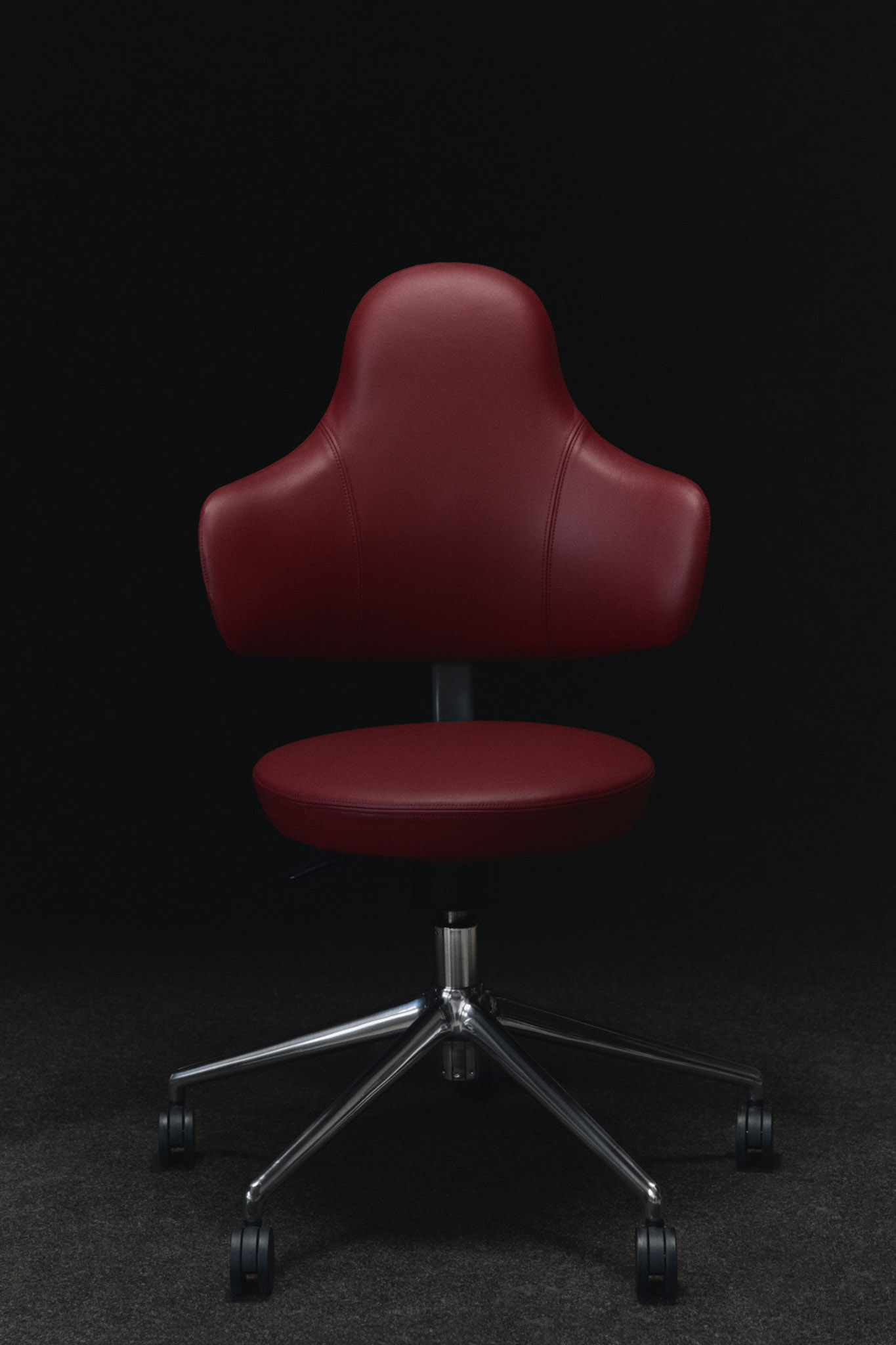 I djupt rött bordeauxläder får Savo Spine en närvaro som känns förankrad och självklar. Ytan är taktil och varm — ett material som åldras vackert och bjuder in till användning över tid. Metallkrysset och de mörkare hjulen tillför både visuell tyngd och stabilitet. Tillsammans skapar de en stol som står stadigt i rummet, samtidigt som den speglar ett medvetet förhållningssätt till form, funktion och komfort